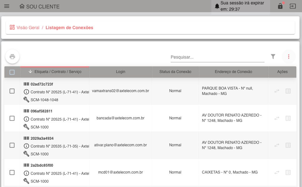 Mostra ao Cliente o número de seu contrato, o serviço contratado, o login utilizado na conexão, seu status, o endereço da instalação, assim como permite algumas ações, como realizar um teste de conexão e também verificar o número de conexões do seu usuário.